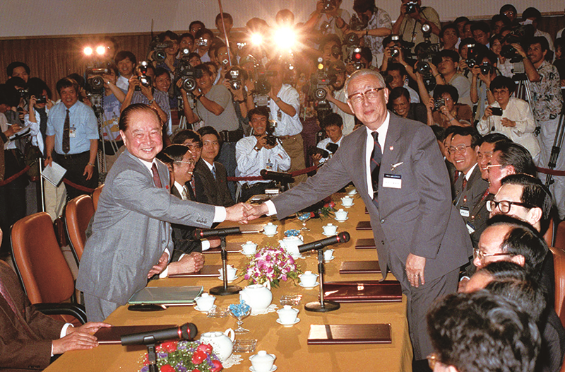 1993年4月27日,首次“汪辜会谈”在新加坡开始,海协会和海基会代表各10人参加了会谈,这是海峡两岸授权民间机构领导人的第一次晤谈。会谈前汪道涵(左)与辜振甫握手。 新华社发