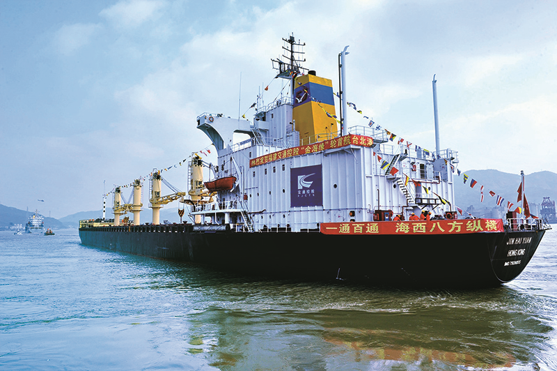 2008年12月15日,海峡两岸海上直航福州港首航仪式举行。图为直航台北港的货轮徐徐离开福州马尾港。 新华社记者 张国俊/摄