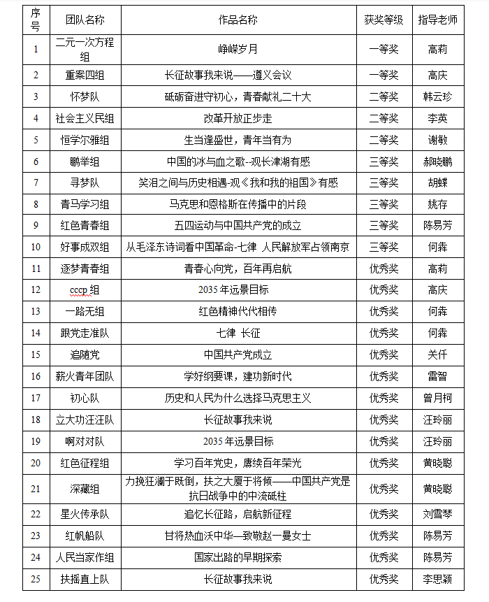 马克思主义学院举办的第一届“求是杯”思想政治理论课实践教学成果大赛已进行完毕,学生从不同的角度聚焦“砥砺奋进守初心•青春献礼二十大”主题,展现思政课的实践教学成果,内容充实、形式多样,可谓精彩纷呈。经过马克思主义学院教师评审团评审,最终评审结果如下: