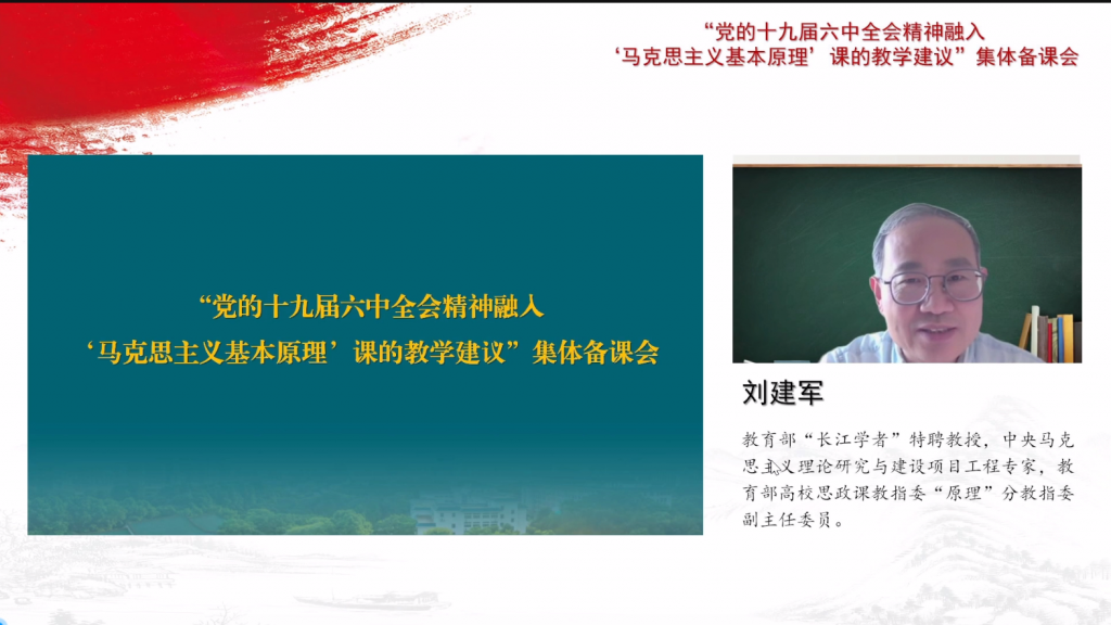 本次集体备课会主讲专家为中央马克思主义理论研究和建设工程专家、教育部高校思政课教指委“马克思主义基本原理”分教指委副主任委员会、中央人民大学马克思主义学院刘建军教授和北京师范大学马克思主义学院熊晓琳教授。