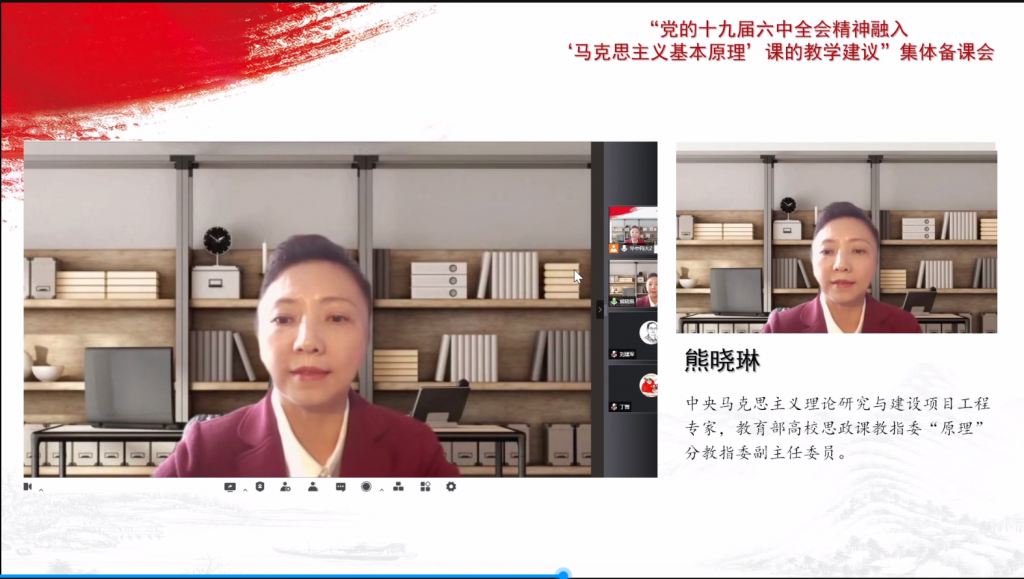 熊晓琳教授则立足于微观层面,从总体上领会和把握十九届六中全会精神,特别是六中全会精神融入“原理”课章节建议这两个方面展开细致的指导建议,其中特别强调了要将六中全会精神作为“原理”、作为“素材”、作为“精神”融入到课程教学当中。