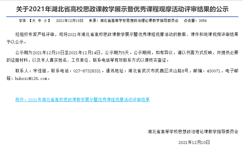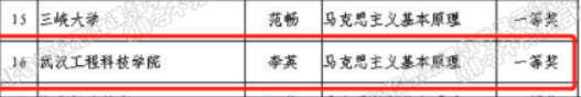 (通讯员 郝晓鹏)在全校大力开展党史学习教育和推进党的十九届六中全会精神宣讲之际,近日,湖北省教育厅、省高等学校思想政治理论课教学指导委员会公布《关于2021年湖北省高校思政课教学展示暨优秀课程观摩活动评审结果的公示》,我校马克思主义学院李英老师斩获一等奖,汪玲丽、郝晓鹏、张美华三位老师分别获二等奖,关仟老师荣获三等奖,彰显了我校思政课在教学改革创新等方面取得的显著成效。