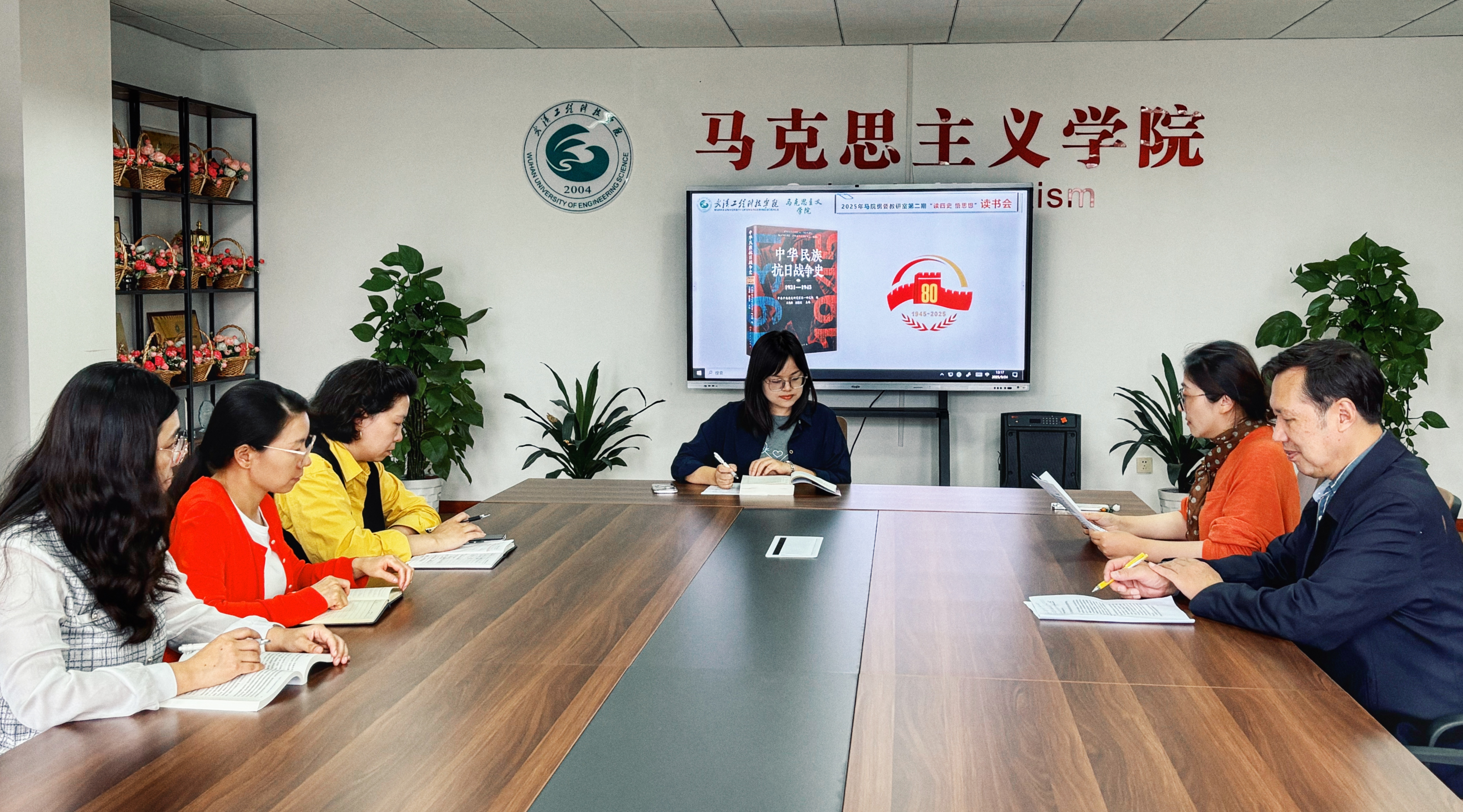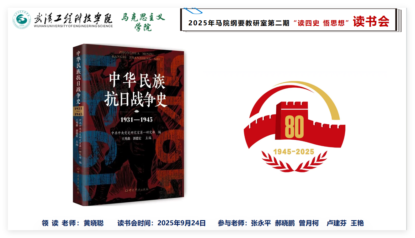 (通讯员 王艳)为进一步深入贯彻落实习近平总书记关于“四史”学习教育的重要指示精神,深化思政课教师对中国人民抗日战争史的理解与感悟,切实将历史厚度转化为育人温度,2025年9月24日下午,马克思主义学院中国近现代史纲要教研室在综合楼409会议室召开了以“读四史•悟思想”为主题的第二期读书会。本次读书会由黄晓聪老师领读,全体教师围绕著作《中华民族抗日战争史 1931—1945》开展了集体学习并进行了充分研讨。