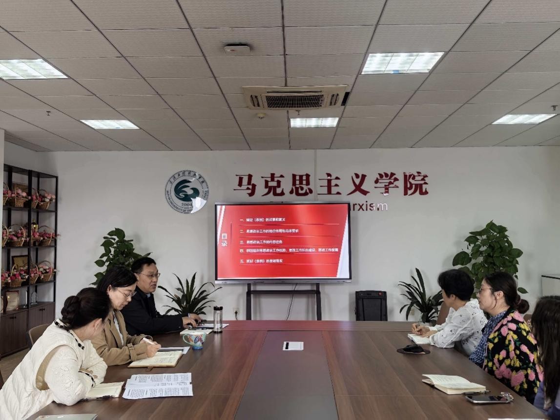 (通讯员 姚存 郭财莉)2025年10月29日,马克思主义学院党总支理论学习中心组于综合楼409会议室开展了2025年10月集体学习活动。此次学习围绕学习中共二十届四中全会精神、《习近平谈治国理政》第五卷和《中国共产党思想政治工作条例》展开。会议由学院党总支书记高莉主持,党总支理论学习中心组成员和教研室主任参会。
