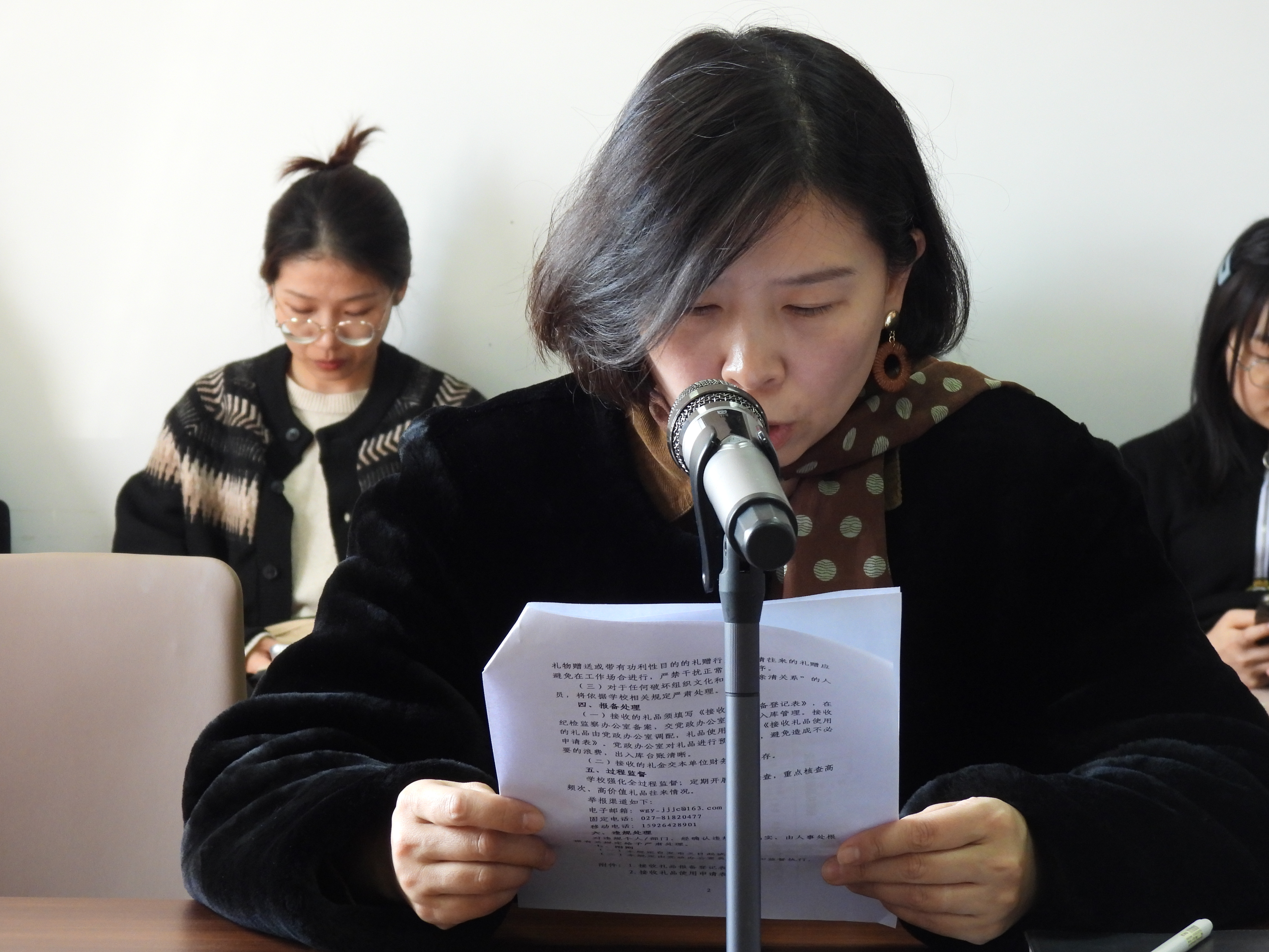 党总支纪检委员曾月柯带领大家专题学习《规范礼品交往行为的管理规定》,逐条解读规定内容,要求全体教职工明确对外、对内交往中的“红线”与“底线”。