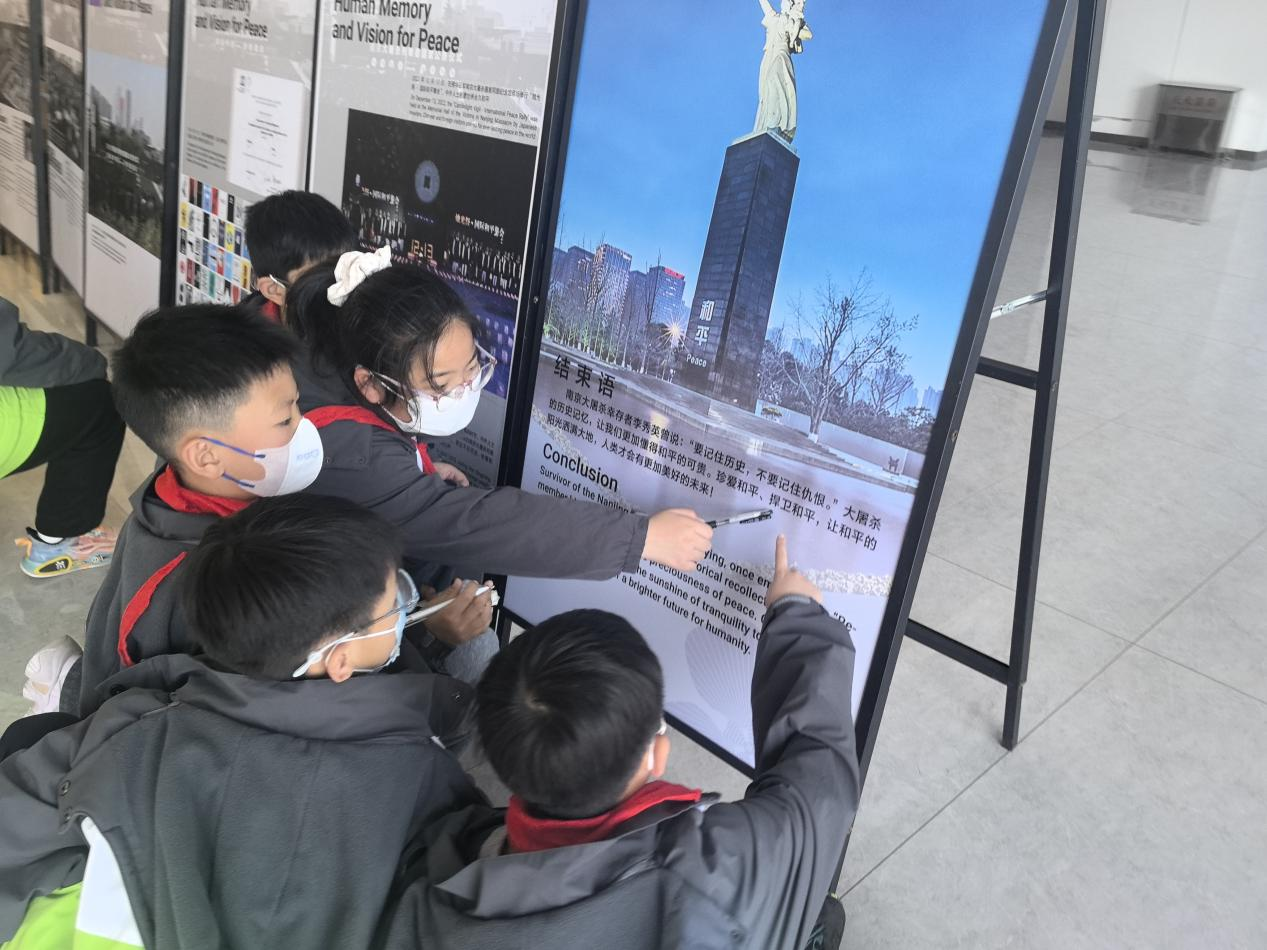 随后,武汉工程科技学院“求是”宣讲队的秦毓桓同学化身讲解员,带领明熙小学的师生们进行有序参观。一幅幅触目惊心的历史照片、一段段饱含血泪的文字记述,将师生们的思绪拉回1937年那个山河破碎的黑暗冬天。同学们全神贯注聆听讲解,深切感受侵略者的暴虐行径、战争的残酷无情与和平生活的来之不易。秦毓桓同学的讲解专业且富有感染力,让遥远的历史变得可感可知,既激发了同学们对遇难同胞的深切同情,更唤起了大家对国家命运的深沉思考。