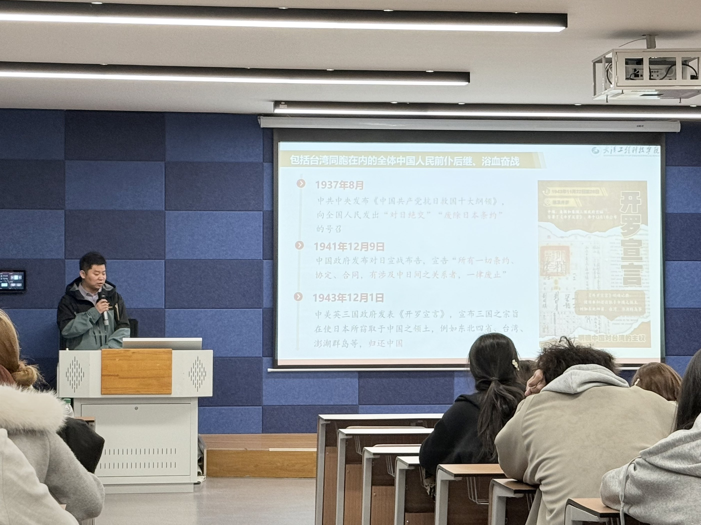 授课过程中,王加青紧扣主题,从历史法理、统一大势、实践路径三个方面展开深入讲解。首先他从历史维度系统梳理了台湾问题的由来与发展脉络,明确指出台湾问题是因民族弱乱而产生,台湾是中国一部分的地位从未改变,解决台湾问题终究要靠中国人自己。随后聚焦统一大势,结合翔实的案例和数据,阐明国家统一是大势所趋、人心所向,强调必须坚决反对“台独”分裂行径,坚决反对外部势力干涉,牢牢把握两岸关系的主导权与主动权。最后着眼实践路径,围绕深入贯彻新时代党解决台湾问题的总体方略、共同传承弘扬中华文化、深化两岸经济合作与融合发展、共创中华民族绵长福祉等方面,系统讲解了推动两岸关系和平发展、实现祖国完全统一的实践路径。